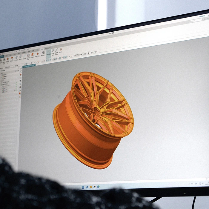 Auswahl des Speichenmusters (Y-Speiche/Mehrfachspeiche/tief konkav) mit 3D-Rendering. Mehrere Oberflächenoptionen, einschließlich Diamantschliff, Chrom, poliert oder gebürstet.
